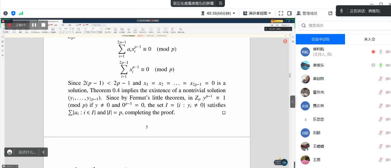 高维东教授结合自身的科研成果,详细地介绍了关于Erdos-Ginzburg-Ziv定理证明的几个不同数学方法, 使线上师生进一步领略到了数学的魅力。报告后,高维东教授就线上师生提出的问题,与教学部师生进行了深入的交流。近期系列学术报告,教学部师生积极参与,反响热烈。Av线上看 将进一步邀请交叉学科方面的专家积极探索学科交叉的可行性,营造浓厚的科研氛围,提升师生科学研究水平。
