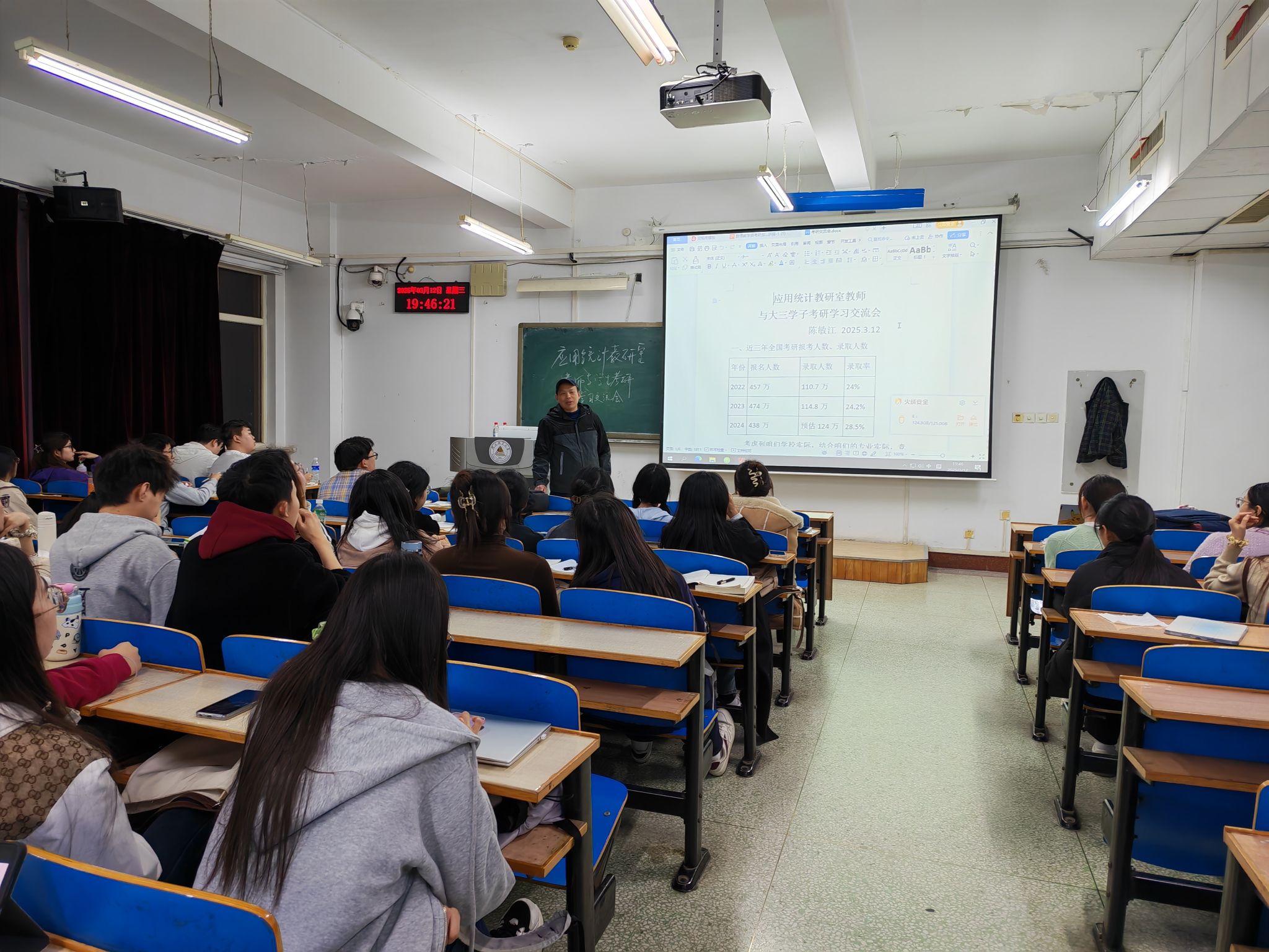 讲座中,陈敏江老师从考研择校选专业、复习时间安排和科学的复习方法等多个方面进行了详细的讲解。陈老师娓娓道来,详实的考研数据、生动的案例剖析,为同学们带来了一场幽默风趣、内容充实的考研指导盛会。现场不时爆发出热烈的掌声、气氛热烈。答疑环节,同学们踊跃发言、积极提问,李占乔、陈敏江和田晓三位老师耐心解答、悉心指导,活动持续将近三个小时,大家纷纷表示受益匪浅。
