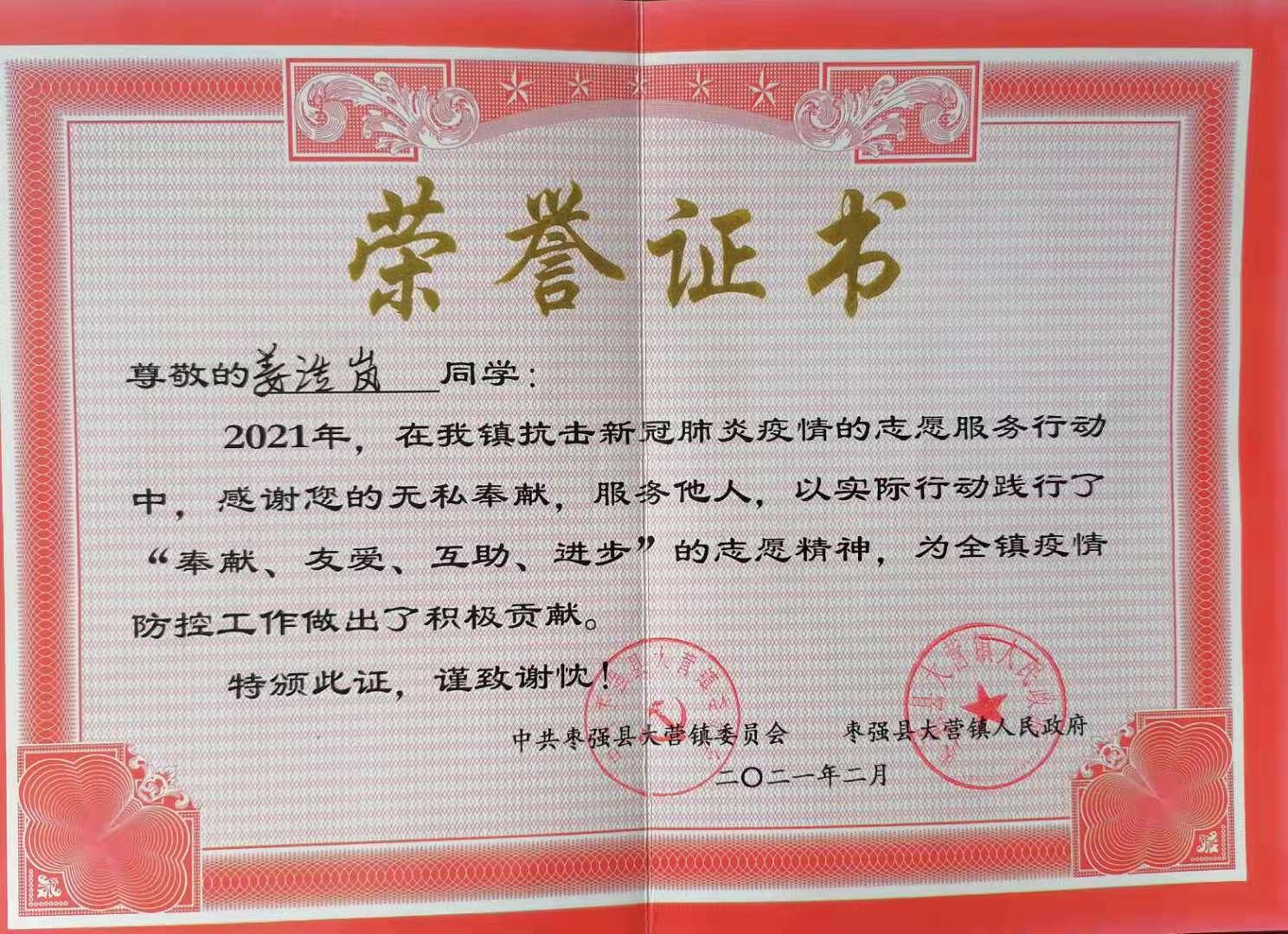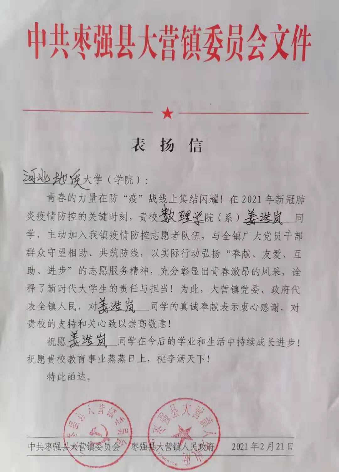 近日,我部收到河北省枣强县大营镇党委向学校发来的表扬信,枣强县大营镇党委对我部2019级信息与计算科学专业姜浩岚同学提出表扬,并向姜浩岚同学颁发了荣誉证书。