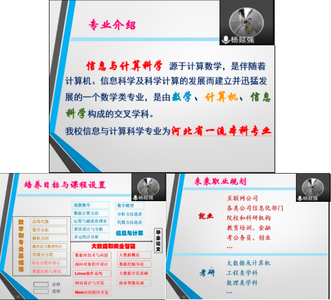 信息与计算科学专业的杨延强老师介绍了作为河北省一流本科专业的信息与计算科学专业,他从信计专业的优势、培养目标与课程设置、学生未来职业规划及Av线上看