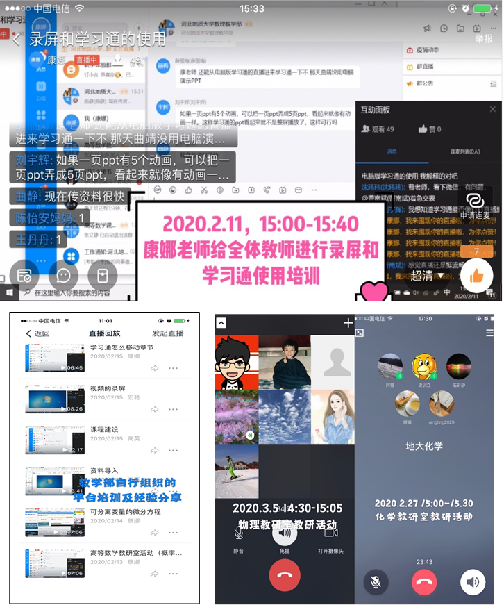 (2)坚持网上教研活动例会制,同时鼓励各教研室、课程组打破“界限”,通过教学部各个教学工作群或视频会议、直播等形式分享平台使用经验、教学方法和教学案例,无论是新入职的年轻教师,还是工作几十年的教师,大家都是全身心投入,废寝忘食,认真学习,以一种全新的“传帮带”推动教学工作。自2月初至现在,各教研室几乎都组织了超过10次的线上教研活动,大家齐心协力,共同学习,共同进步,对整个教学部线上教学工作起到了很好的推动与引领作用。