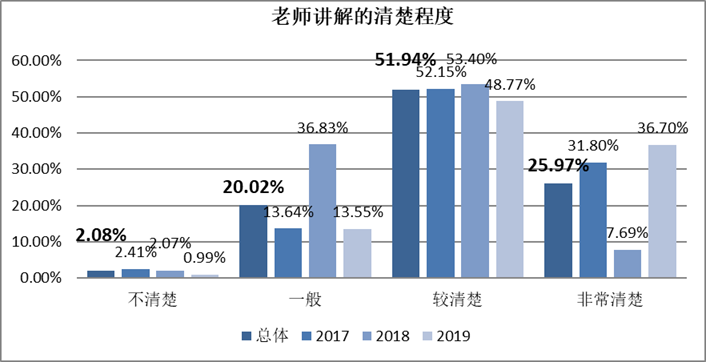 有近80%的学生认为老师对于知识的讲解清楚透彻,其中认为较清楚的占51.94%,还有25.97%的学生认为老师讲解的非常清楚;有22%的学生认为老师讲解的一般甚至是不清楚。