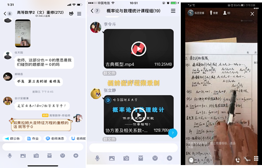 (2)教学平台的使用:学生们反映,通过对多门课程多个软件的效果对比,学生们比较认可“钉钉”平台,特别是钉钉直播,比QQ直播屏幕大,关键是可回放,方便学生反复观看。