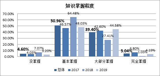 通过调研发现,学生们对这些专业课程的掌握程度整体一般,完全掌握的只占5.04%,大部分掌握的占39.40%,有50.96%的学生基本掌握所讲的知识点,还有4.6%的学生没能掌握所授知识点。