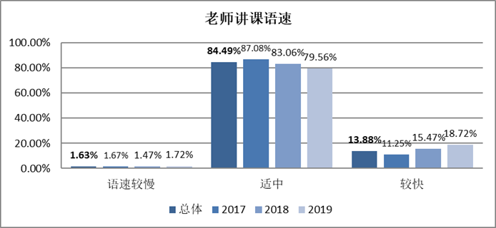 通过这个统计可以看出,学生们认为大部分老师的讲课语速是合适的,三个年级的总体满意度近85%,有13.88%认为老师语速较快,还有1.63%的学生认为老师语速较慢。