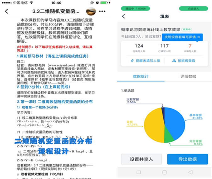 (5)注意教学设计,抓住质量之核心,在教学环节中突出实现学生学习之主。学部全体教师都高度重视并认真对待线上教学,认真做好每节课的课程设计,通过细化教学环节中的各个流程。例如概率论与数理统计课程组采用“提前布置学习任务及思考问题+学生观看网络精品课程+课堂在线直播讲解重难点+在线交流+课堂小测巩固知识成果+课后作业”的方式, 这样,一方面通过增加师生之间的良好互动,加大学生的“学”的时间和力度,实现学生对知识点的理解,强化课堂效果;另一方面可以更精确地对学生的学习情况和对知识的掌握情况进行有效监督;通过学生反馈的情况对课堂教学设计及时调整,来提升教学效果。