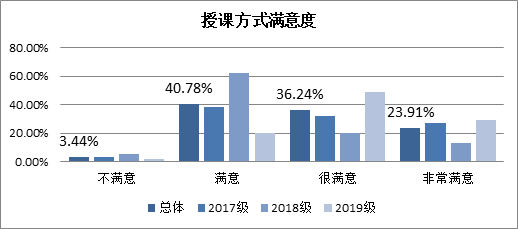 通过对三个年级的21门专业课程的调查显示,绝大部分的同学对这些课程的授课方式表示满意,总体满意率达到96.56%,只有3.44%的学生对这些课程的授课方式表示不满意。(数据用小沈计算的最新的数据,条目改成 非常满意 满意 基本满意 不满意)