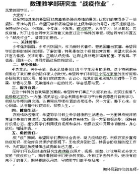 为更有效地指导研究生在延期开学期间的教育教学工作,真正做到“停课不停学、停课不停研”,数学教学部的全体导师一方面纷纷通过QQ或微信平台,给学生布置学习任务或规划学习计划,在无法购买纸制教材的情况下,积极寻找电子教材发给学生,引导学生自主学习。另一方面,积极开展网络教学的学习培训和准备,把停课不停教的要求落到实处。辅导员也积极寻找并推荐分享免费的期刊下载平台,网络学习APP等资源。