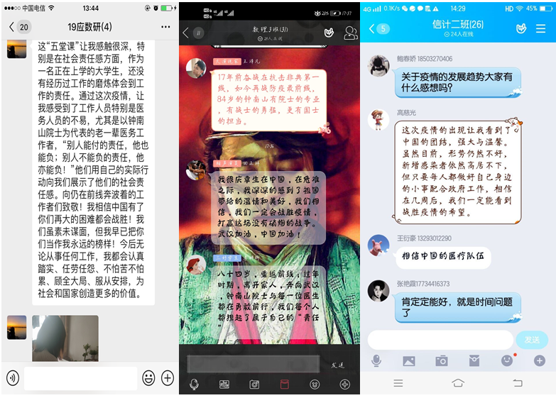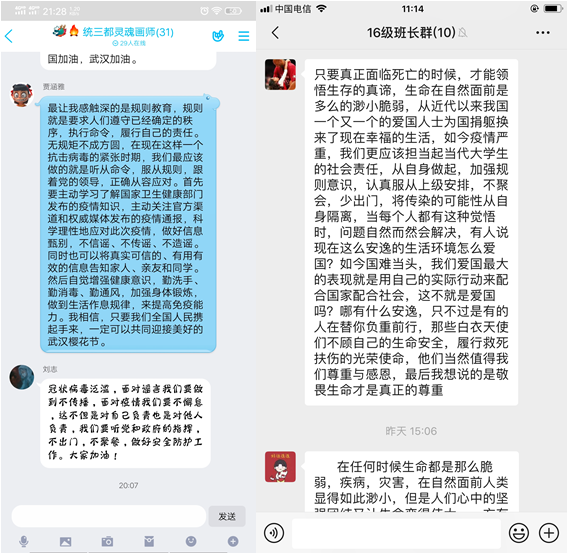 本科生辅导员在学生群中开展线上讨论主题教育活动。在这场“抗疫”阻击战中,每个学生将自己的思考和感悟在群中与大家进行分享。2019学生田正祥说:“我很庆幸自己生在中国,在危难之际,我深深的感受到祖国带来的温情和美好。”2018级学生高慈光说:“这次疫情的出现让我看到了中国的团结,强大与温馨。虽然目前,形势仍然不好,新增感染者依然高居不下,但只要每人都做好自己身边的小事配合政府工作,相信我们一定能够成功。”2017级学生、防疫志愿者贾涵雅说:“最让我感触深的是规则教育,我们最应该做的就是听从命令,服从规则,跟着党的领导,正确从容应对。”2016级学生韩晓晔说:“很多身处武汉的普通民众,不惧疫情蔓延,主动投入到防疫一线做志愿者。隔离病毒,但不能隔离爱,科学有序防控,这是一个现代文明社会对待同胞应有的态度。”