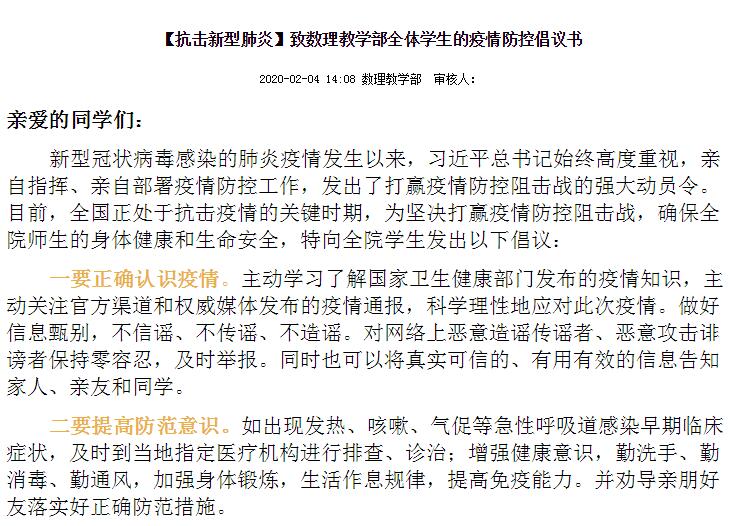 全体学生的疫情防控倡议书》,引导学生正确认识疫情、提高防范意识、科学防护,倡导学生利用假期提升自己的学识和能力,遵守疫情防控期间的纪律,为打赢这场疫情防控阻击战贡献青春力量。