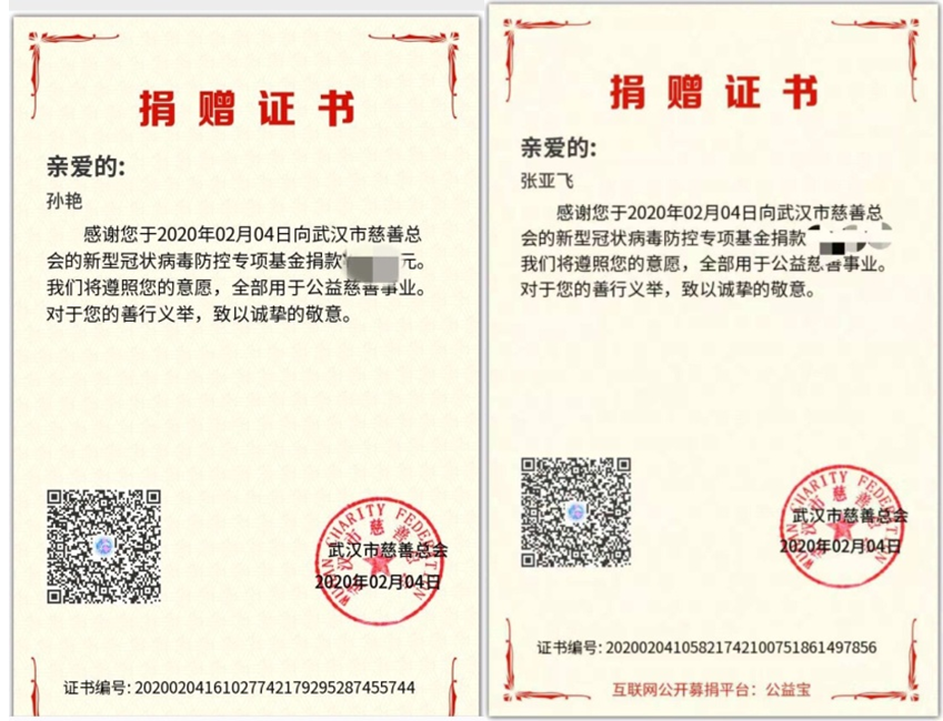 研究生辅导员孙艳老师和19级研究生张亚飞同学向武汉市慈善总会捐款,在湖北遭受疫情的艰难时期传递爱心。