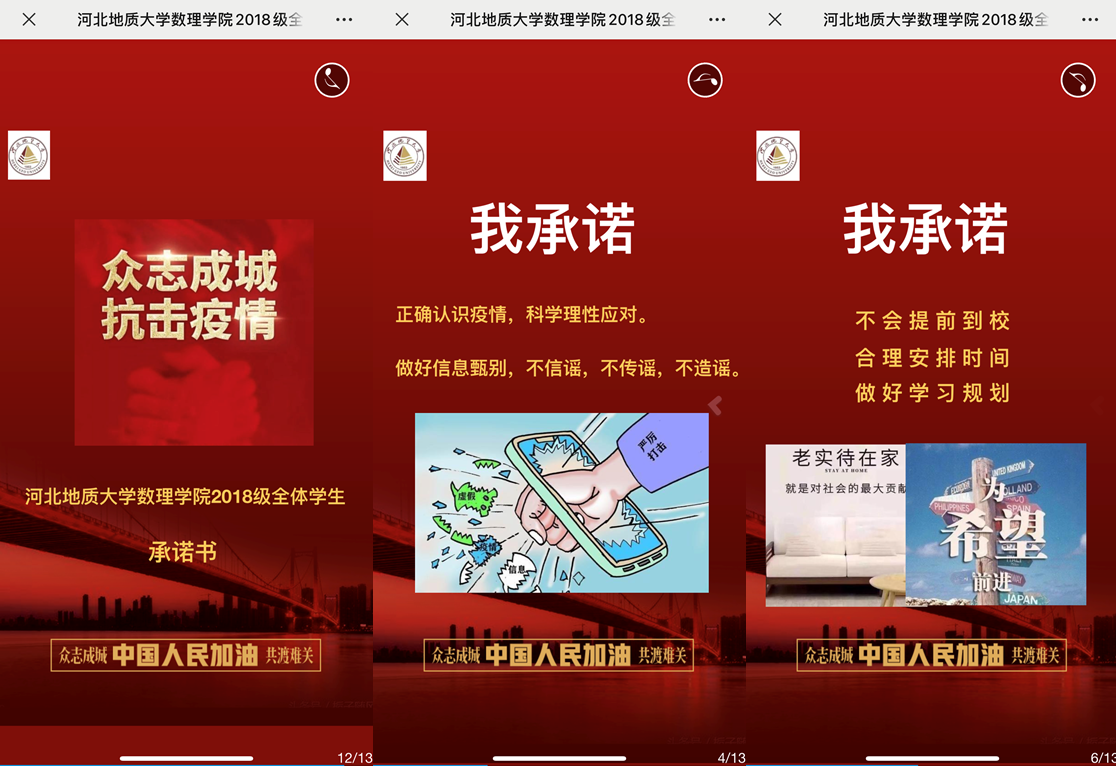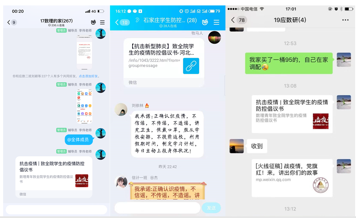倡议发出后,本科生、研究生辅导员在各学生群中转发,得到了学生们积极响应。特别是2018级学生专门制作《承诺书》,表达了自己响应国家、学校号召的决心。